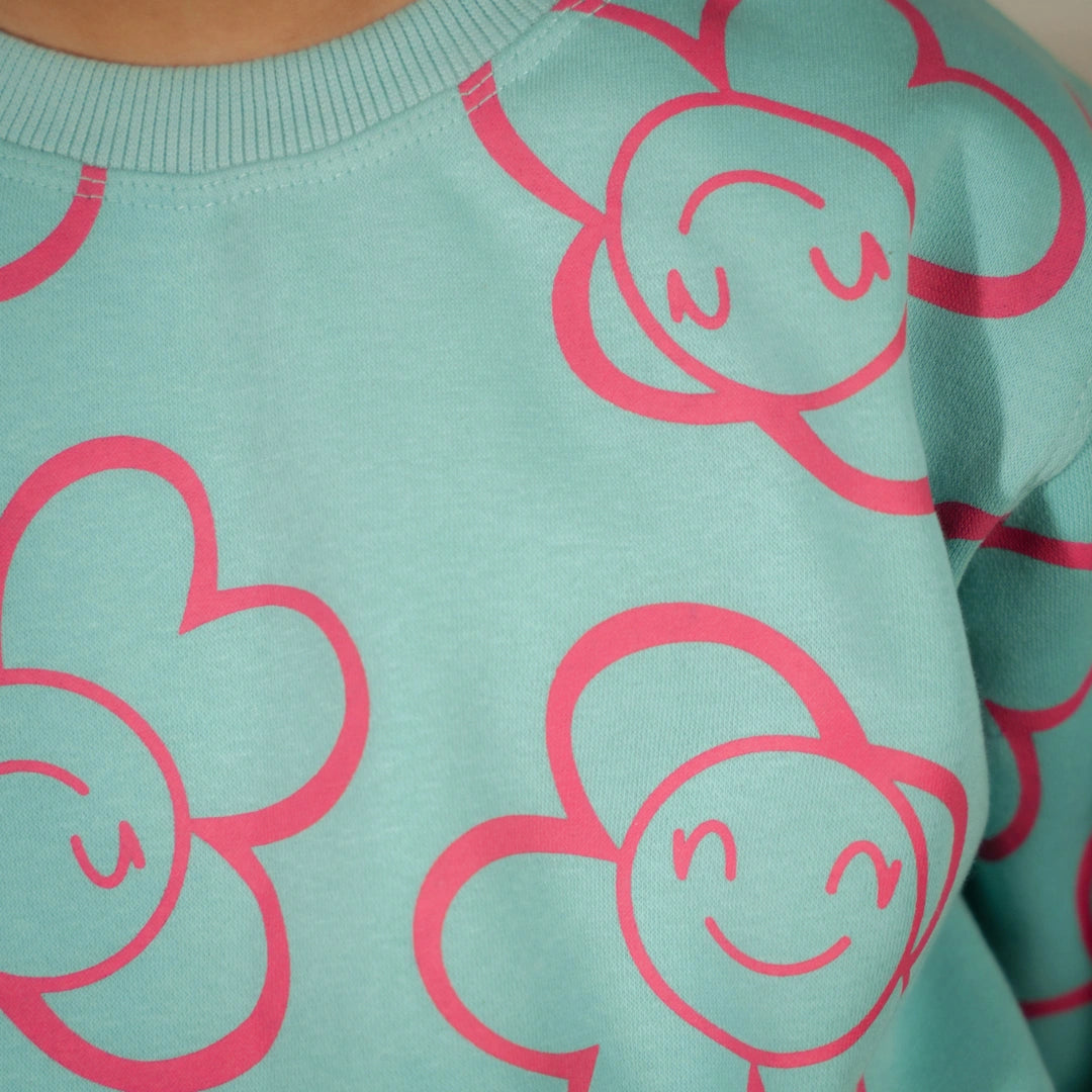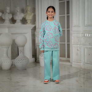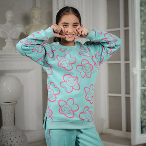 Wrap your little one in comfort with our Aqua Bloom Cozy Fleece Set, featuring a cute all-over smiley-flower print sweatshirt paired with relaxed fleece trousers. Soft, warm, and perfect for winter days a playful yet cozy outfit for everyday wear.
