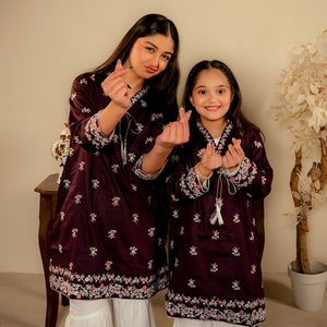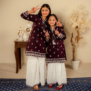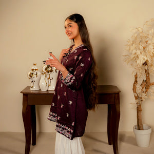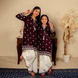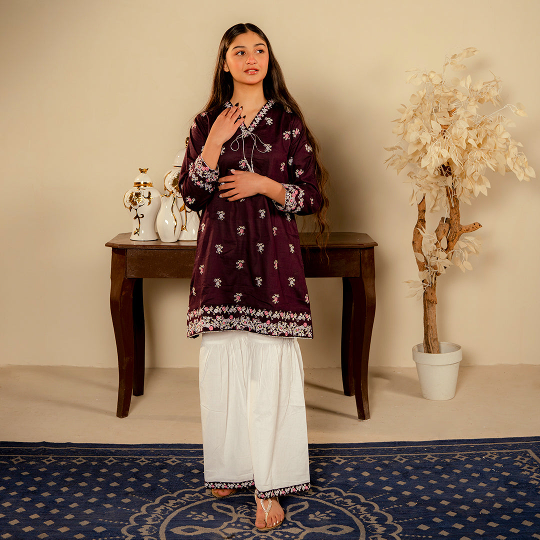 Product Description: Discover the unique charm of "Nayab," a sophisticated ensemble in a deep shade of plum. The shirt is exquisitely designed with white and soft pink floral embroidery scattered across the front, featuring a detailed border at the hem and sleeves. A delicate tie-string with tassels at the neckline adds a traditional touch. This rich colored shirt is paired with contrasting white voluminous trousers, creating a striking and elegant look for any festive occasion.
