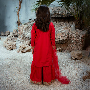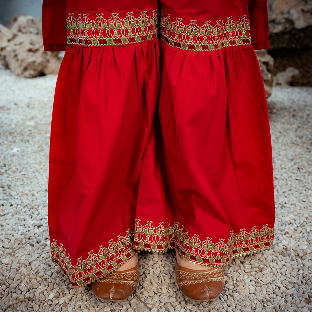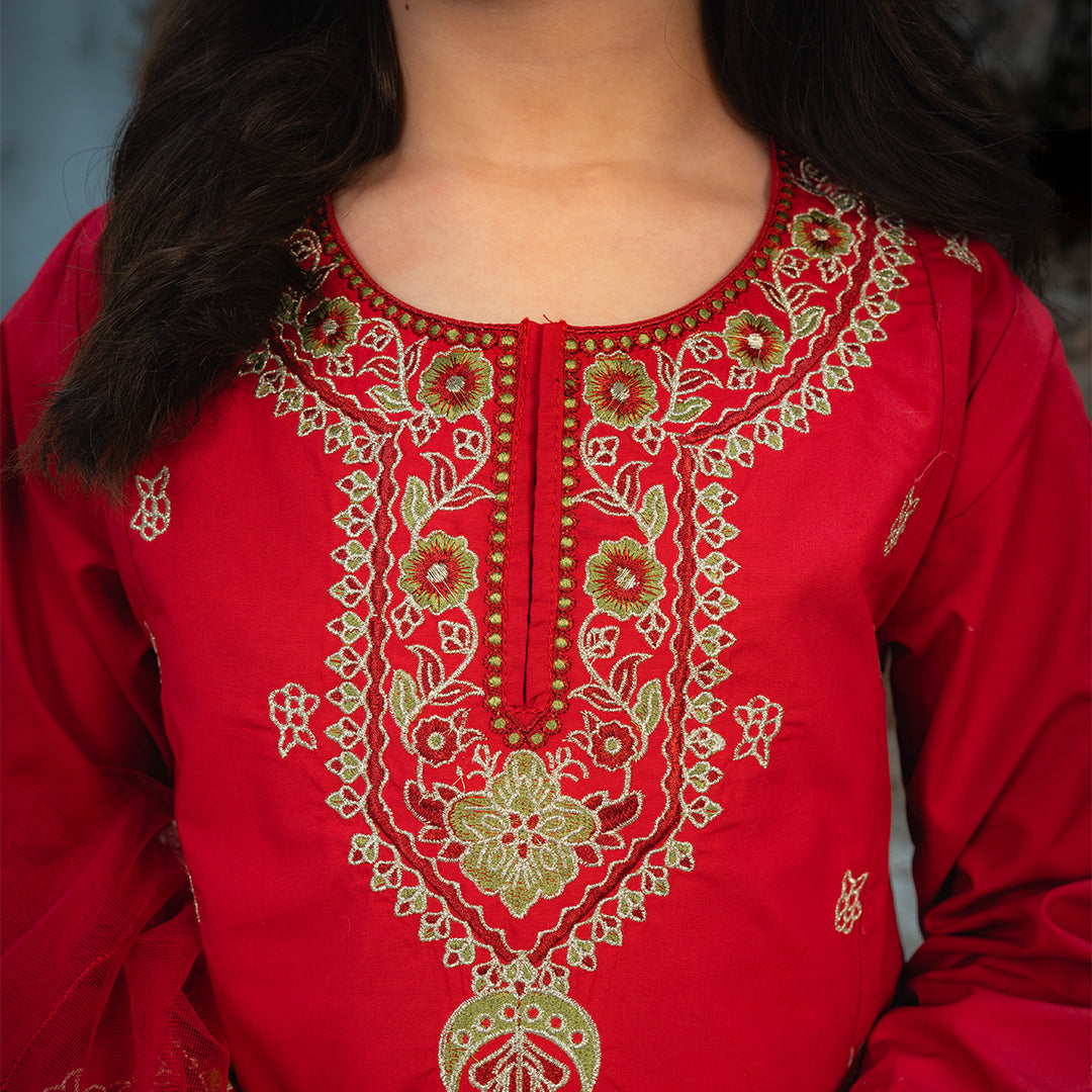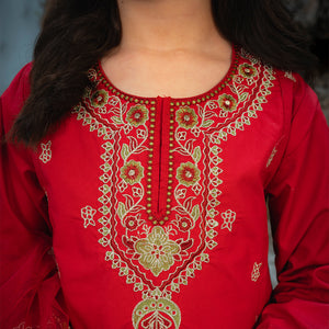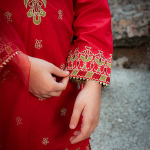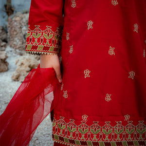 Product Description: Radiate festive brilliance with "Surkhnoor," a breathtaking all-red ensemble designed to turn heads. The shirt features elaborate gold embroidery on the neckline and a central motif, complemented by detailed borders on the hem and sleeves. Paired with matching red wide-leg trousers adorned with embroidered hems and a delicate sheer net dupatta, this three-piece suit is the perfect choice for weddings and special summer celebrations.