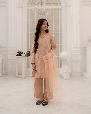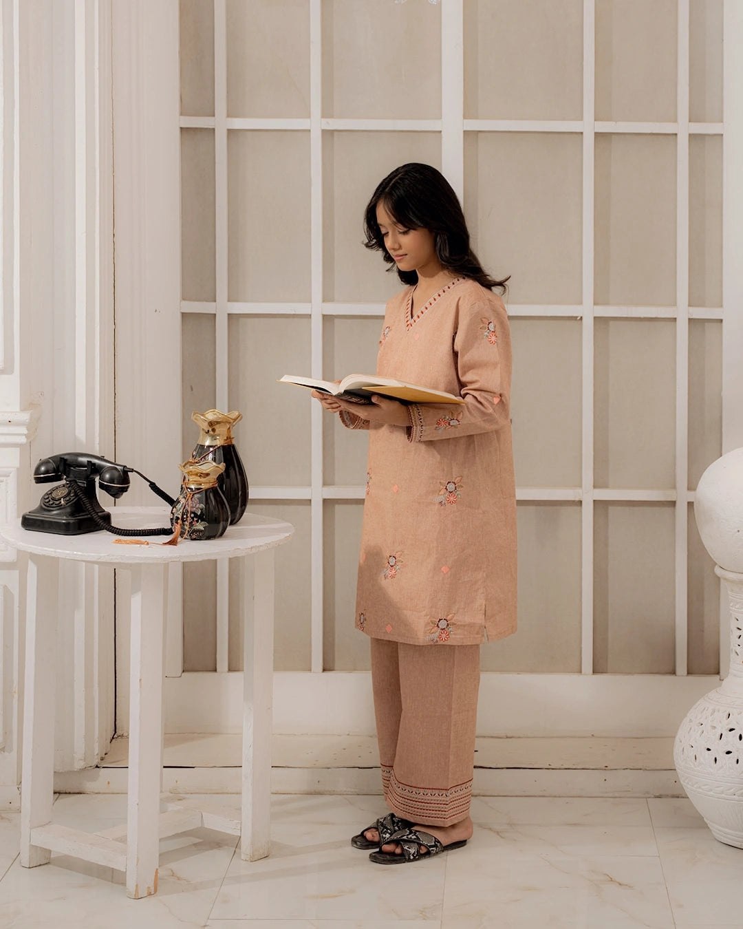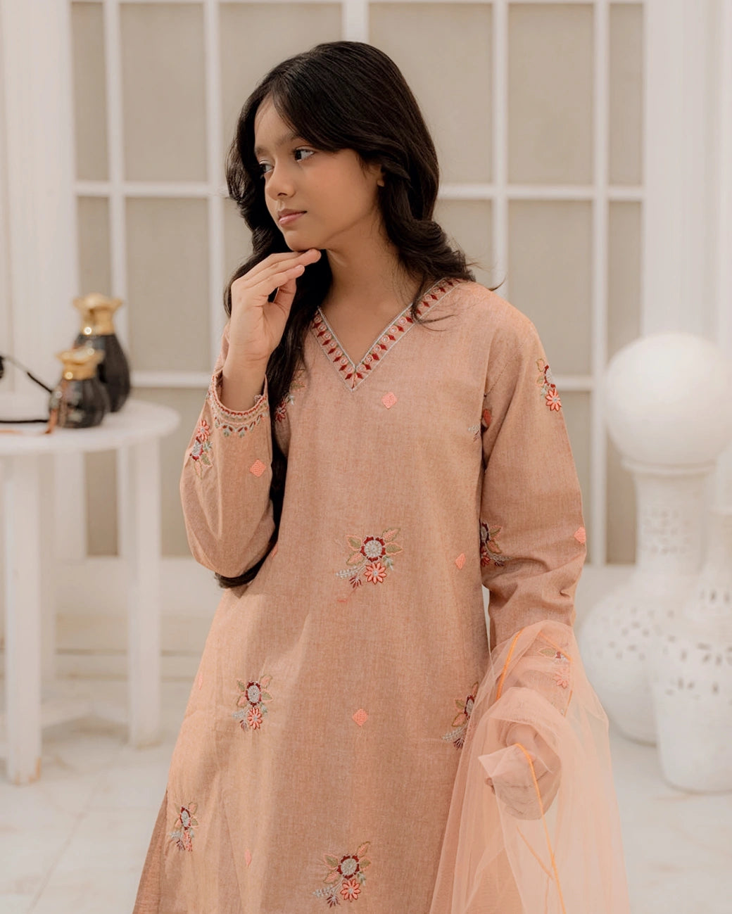 A soft beige khaddar suit adorned with delicate floral embroidery cozy, elegant, and perfect for winter gatherings.