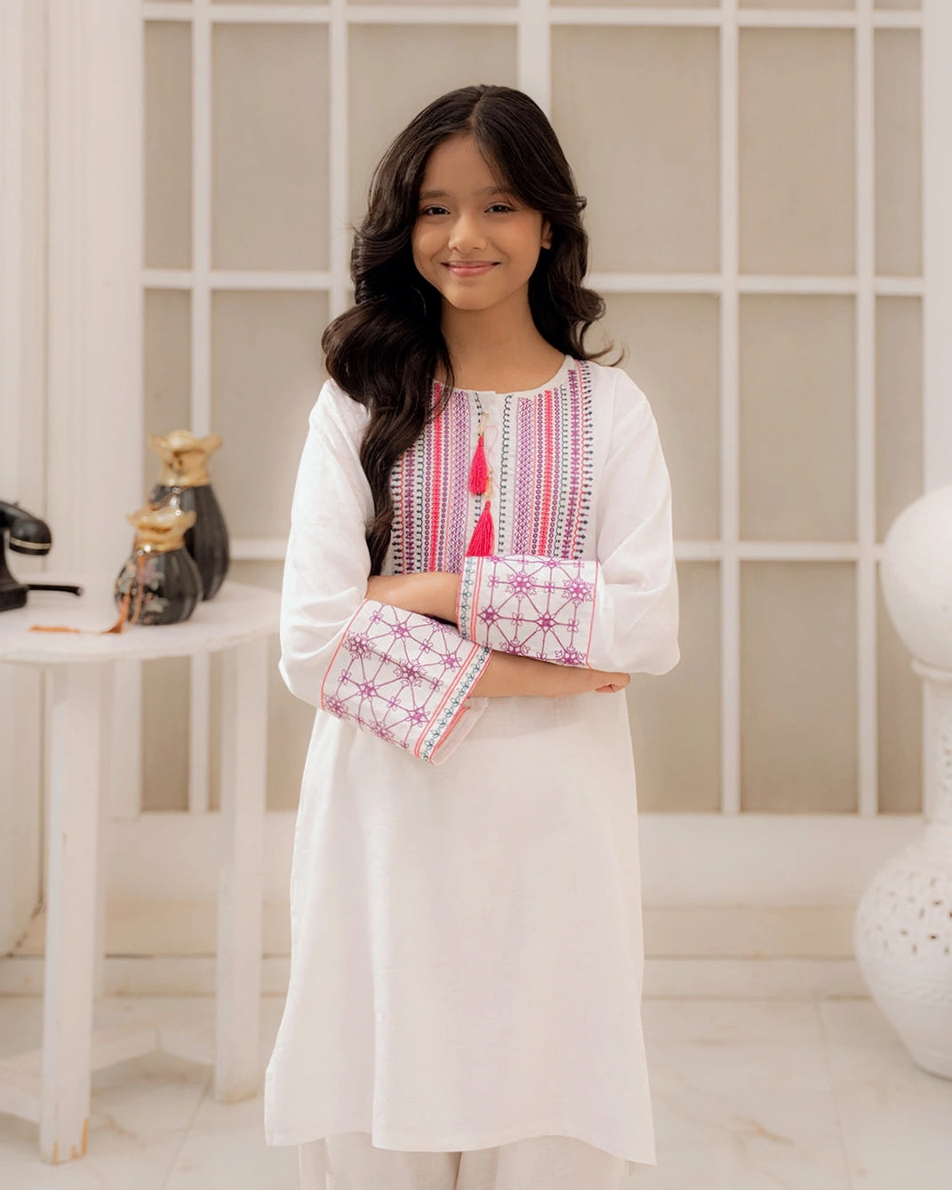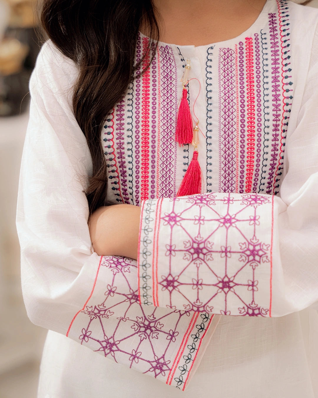 A chic outfit featuring intricate maroon embroidery on soft off-white fabric. Cozy, elegant, and perfect for timeless seasonal charm.