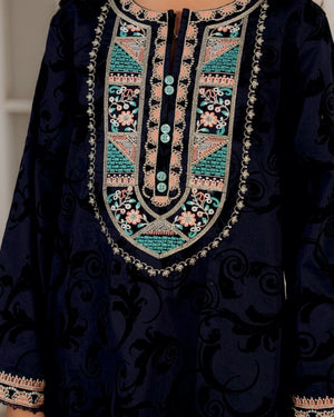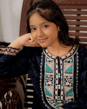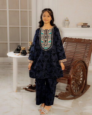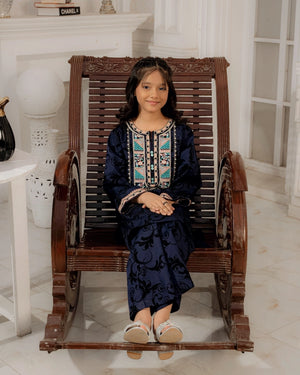 Wrap your little one in cozy elegance with our Midnight Bloom Embroidered Khaddar Suit. Crafted from premium winter khaddar, this deep navy blue ensemble features intricate thread embroidery on the neckline and sleeves, adding a touch of traditional charm. The soft, warm fabric ensures comfort during chilly days, while the rich color and detailed design make it perfect for festive gatherings or casual winter outings.