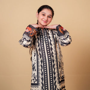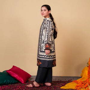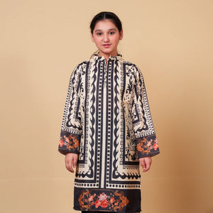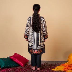 Elegant winter khaddar in black and ivory tones, featuring geometric patterns with floral accents. Warm, stylish, and perfect for seasonal wear.