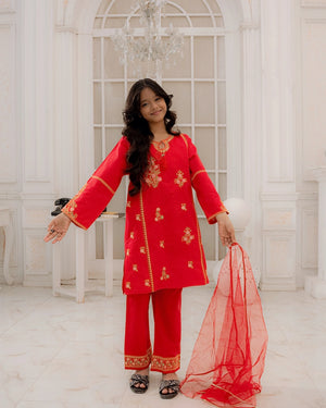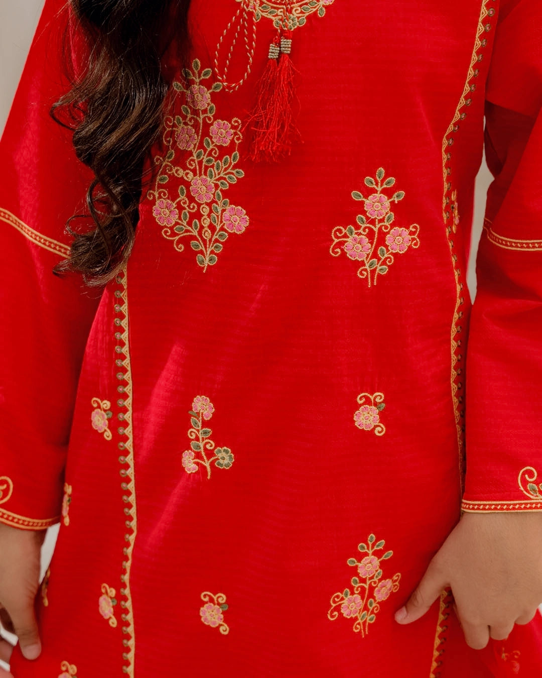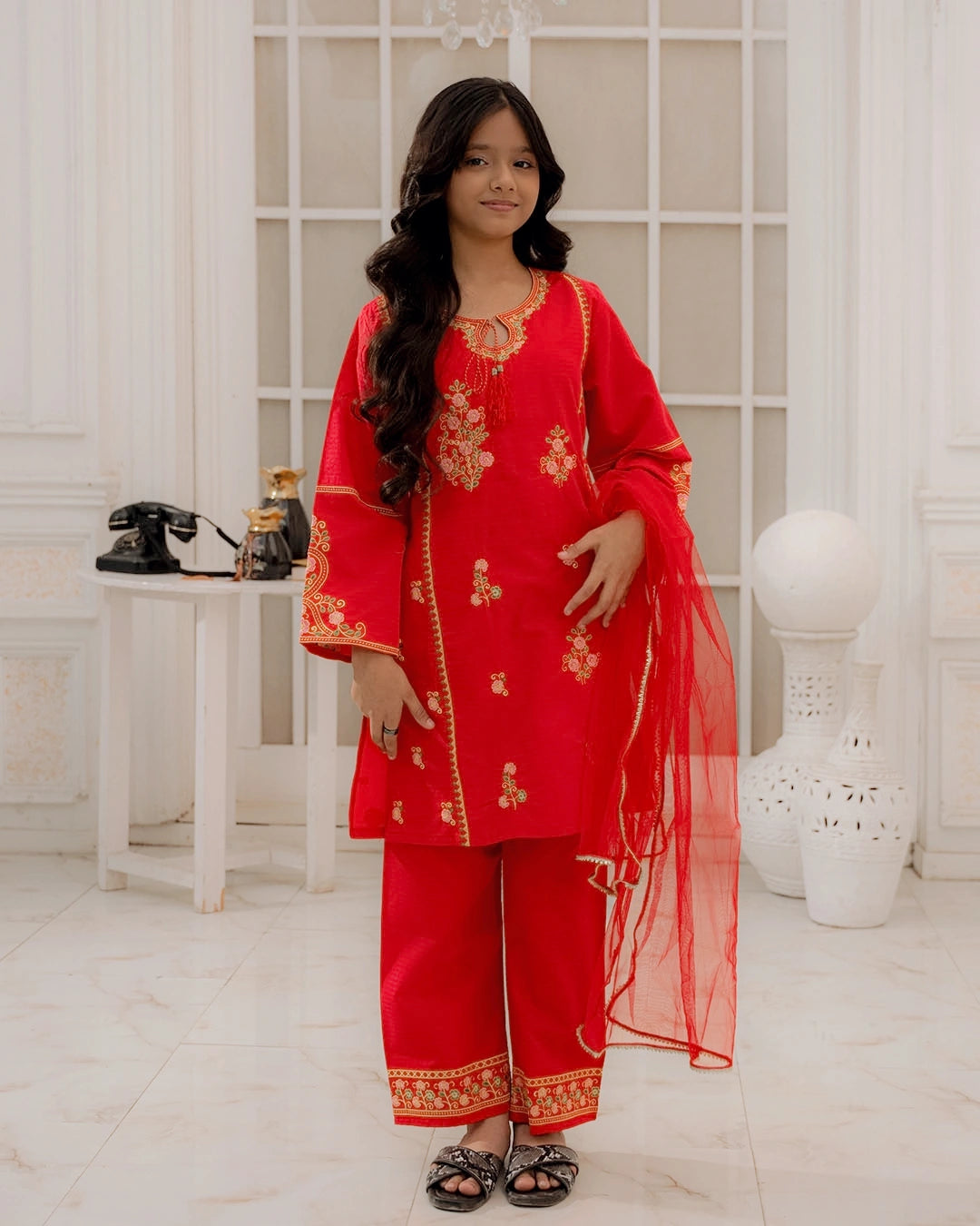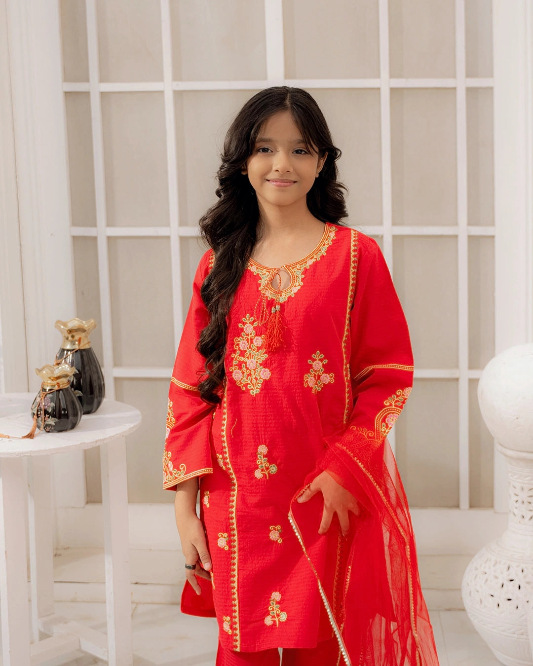 Brighten up winter days with our Crimson Blossom Khaddar Suit, featuring delicate golden embroidery on a vibrant red base. Crafted from premium winter khaddar, this outfit blends warmth, comfort, and festive elegance perfect for seasonal gatherings and family occasions.