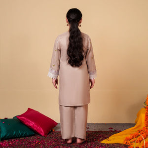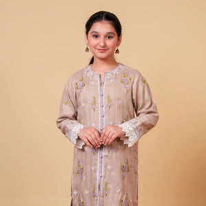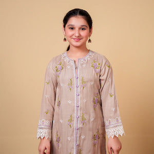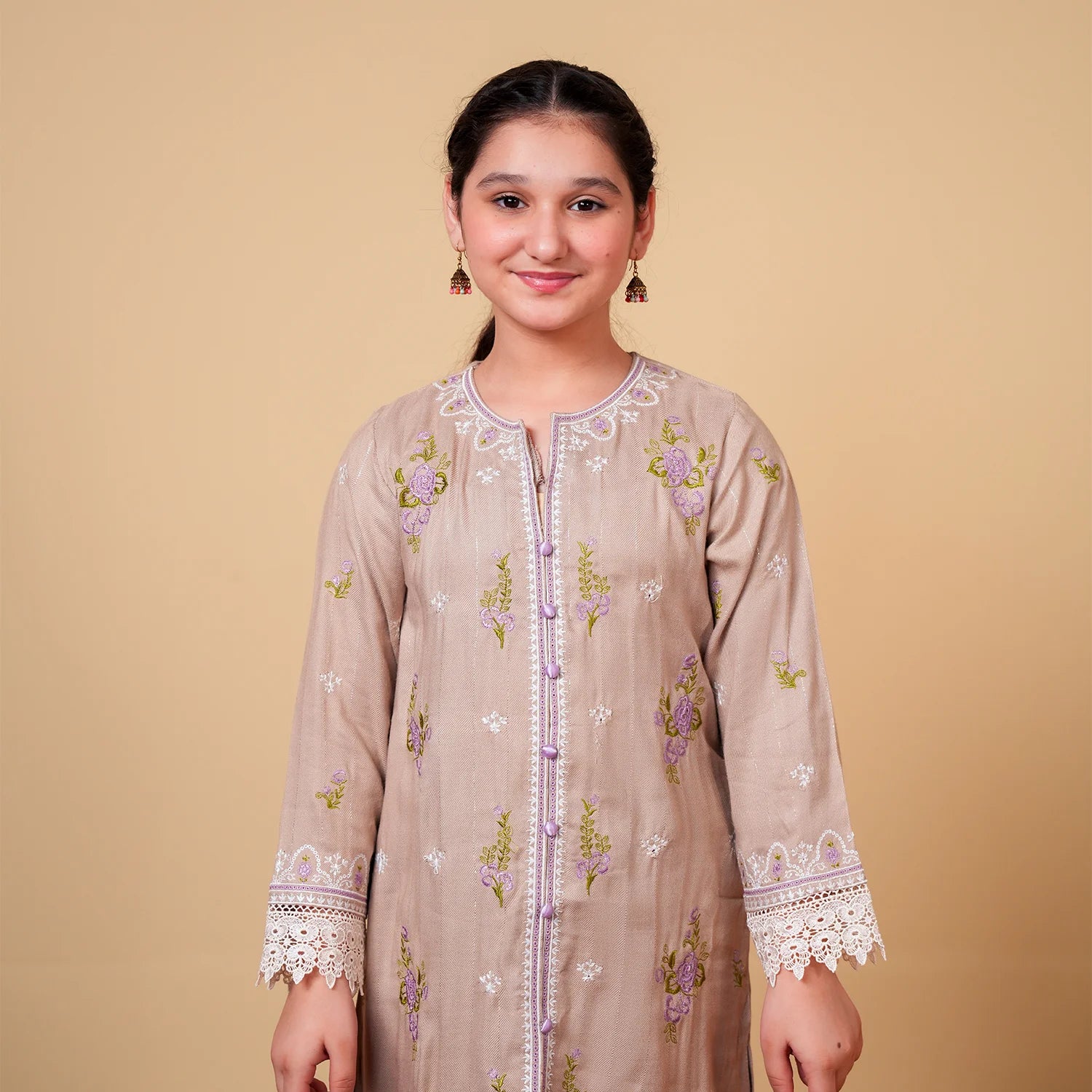A beautifully embroidered khaddar kurta designed for the winter season. Crafted from soft, warm khaddar fabric, it features delicate floral embroidery and lace-detailed cuffs for a refined traditional look. Perfect for casual gatherings or festive occasions.