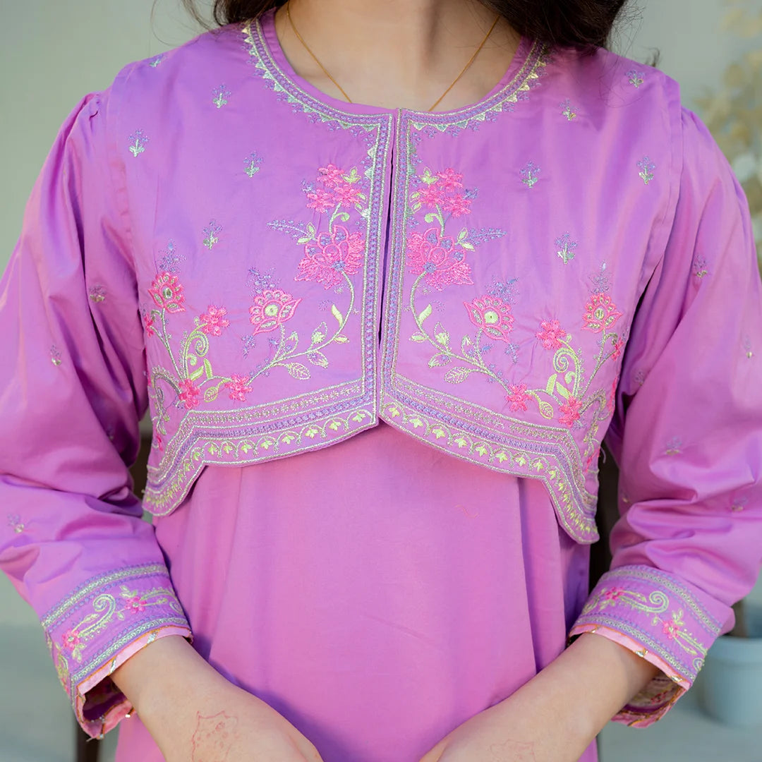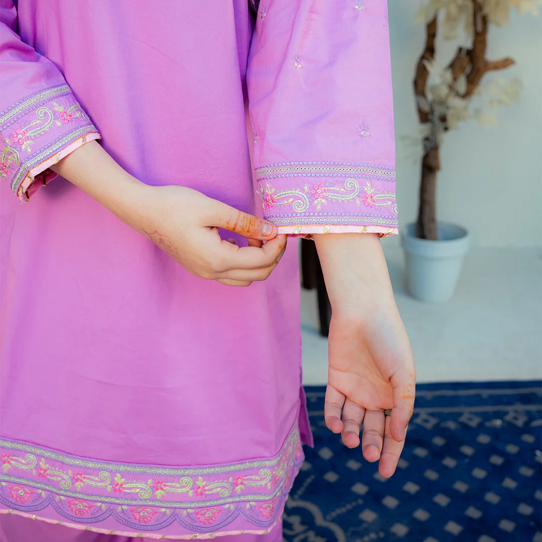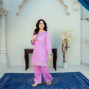 Product Description: Embrace the soft elegance of "Kashish," a delightful lilac cotton ensemble perfect for summer days. This two-piece suit features a stylish embroidered yoke design on the shirt, complemented by intricate detailing on the sleeves and hem. Paired with matching wide-leg trousers adorned with embroidered borders, it offers a chic and breezy look for any occasion.