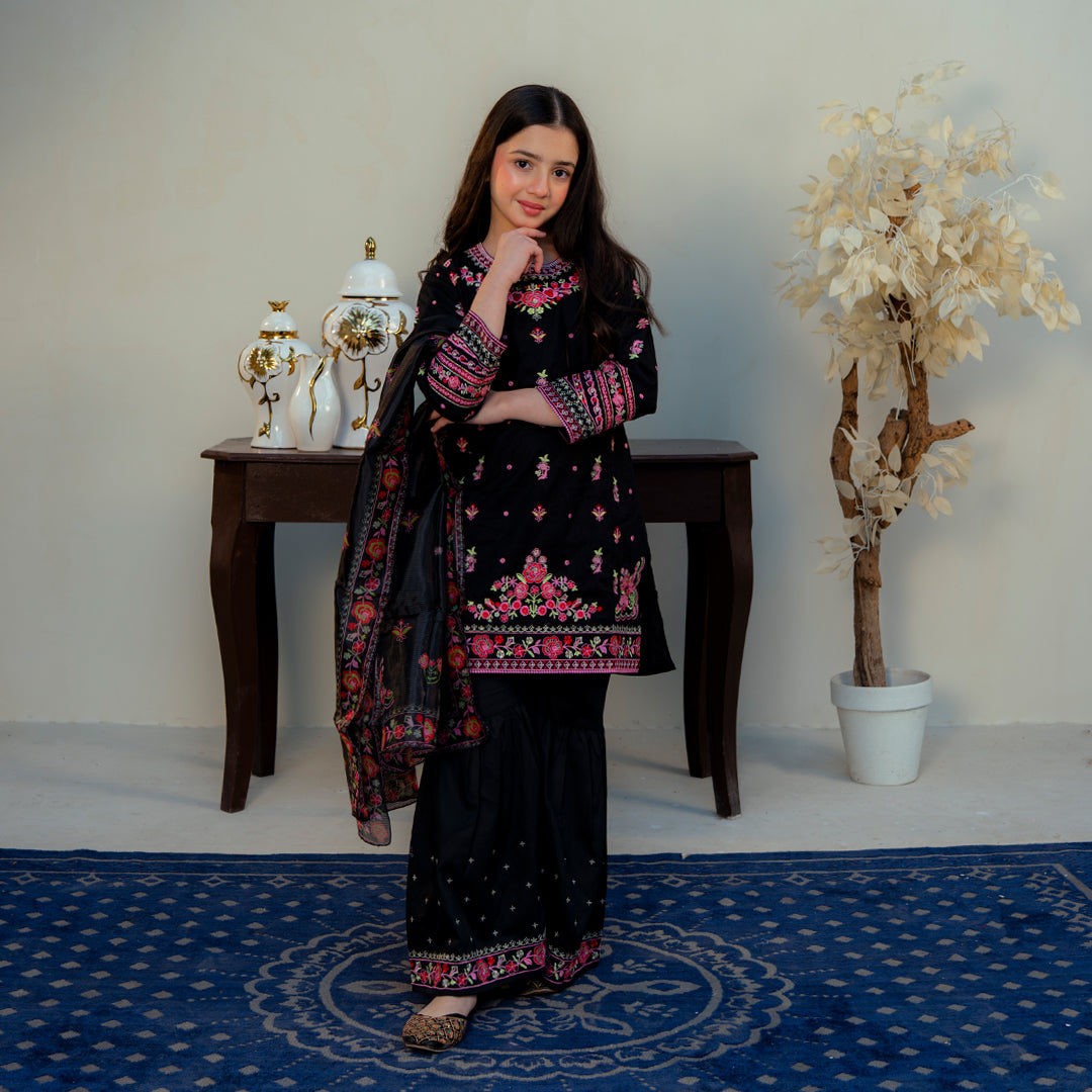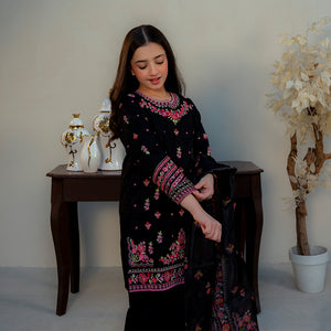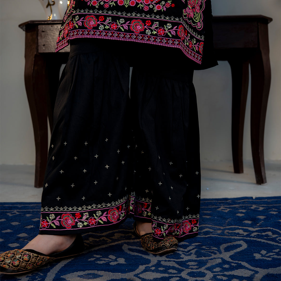 Product Description: Make a bold and beautiful statement with "Siyah," a stunning black ensemble that defines festive elegance. The shirt is richly adorned with vibrant floral embroidery in pink and orange hues across the front and sleeves, creating a captivating contrast against the dark canvas. This look is completed with matching black wide-leg trousers and a gorgeous sheer dupatta featuring coordinating floral patterns and borders, perfect for weddings and formal gatherings.