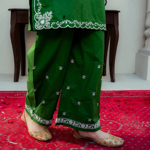 Product Description: Embrace nature's elegance with "Zaitoon," a rich olive green ensemble perfect for the summer season. The shirt features striking white embroidery across the yoke, sleeves, and hem, creating a crisp and classic contrast. Scattered small white motifs adorn the entire outfit, which is paired with matching trousers featuring detailed embroidered borders for a complete and polished look.