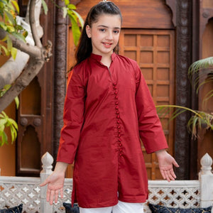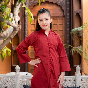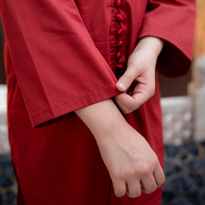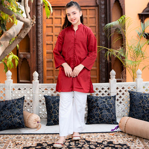 Product Description: Bring a touch of modern minimalism to your festive wardrobe with "Nureh." This sophisticated two-piece ensemble features a solid maroon shirt in high-quality cotton, designed with a clean, structured silhouette. The front is adorned with a unique looped button placket and a refined band collar, adding a subtle yet high-fashion detail to the minimalist aesthetic. Balanced with crisp white wide-leg trousers, this outfit is the definition of understated elegance, making it an ideal choice for semi-formal summer gatherings or daytime events.