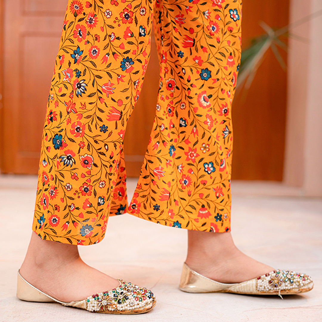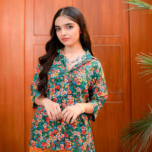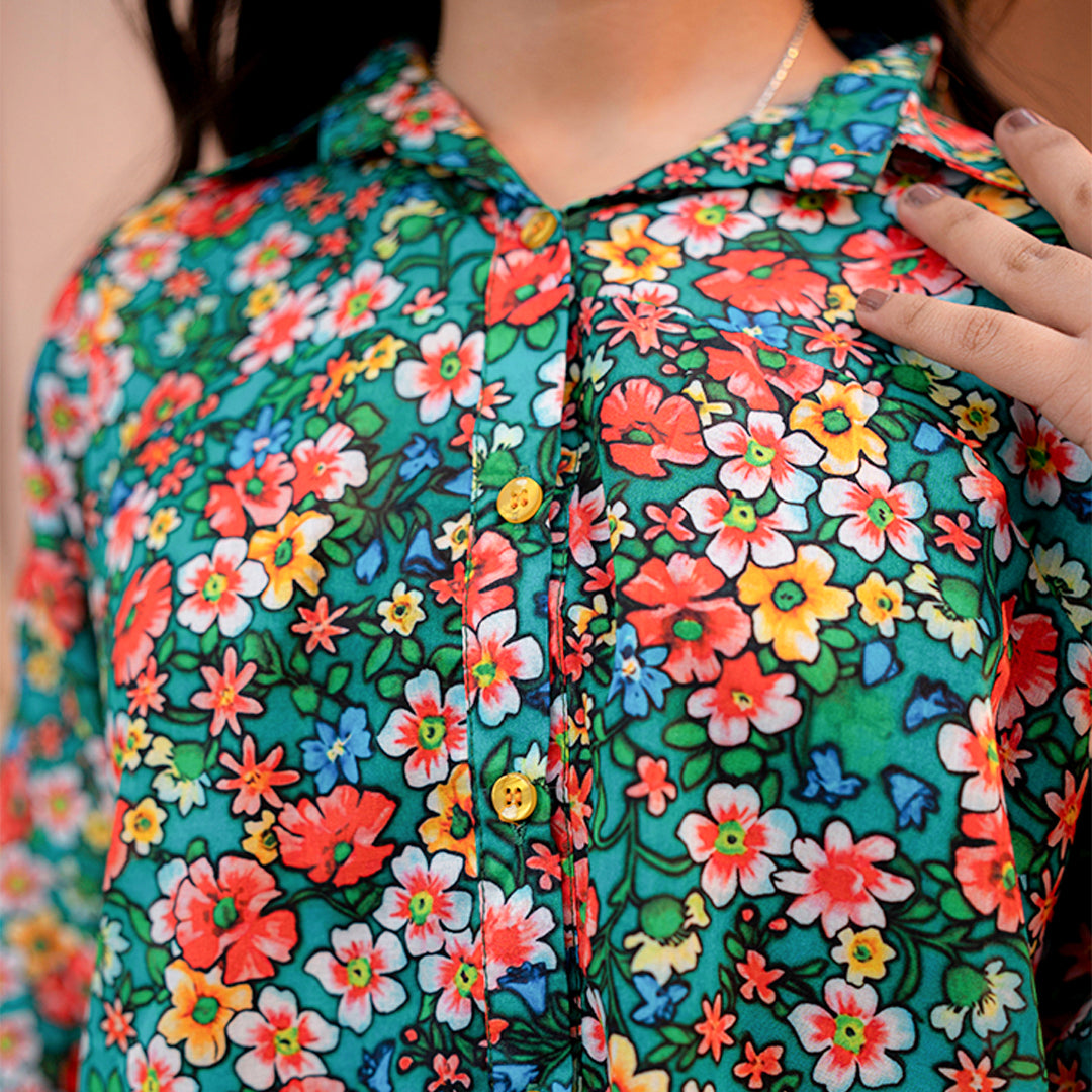 Product Description: Embrace the joy of summer with "Amber," a vibrant and playful ensemble bursting with color. The shirt features a lively floral print in red, yellow, and white against a rich teal-green background, designed with a comfortable V-neckline. It is perfectly mismatched with mustard yellow trousers adorned with their own delicate floral pattern, creating a fun and trendy contrast for casual days out.