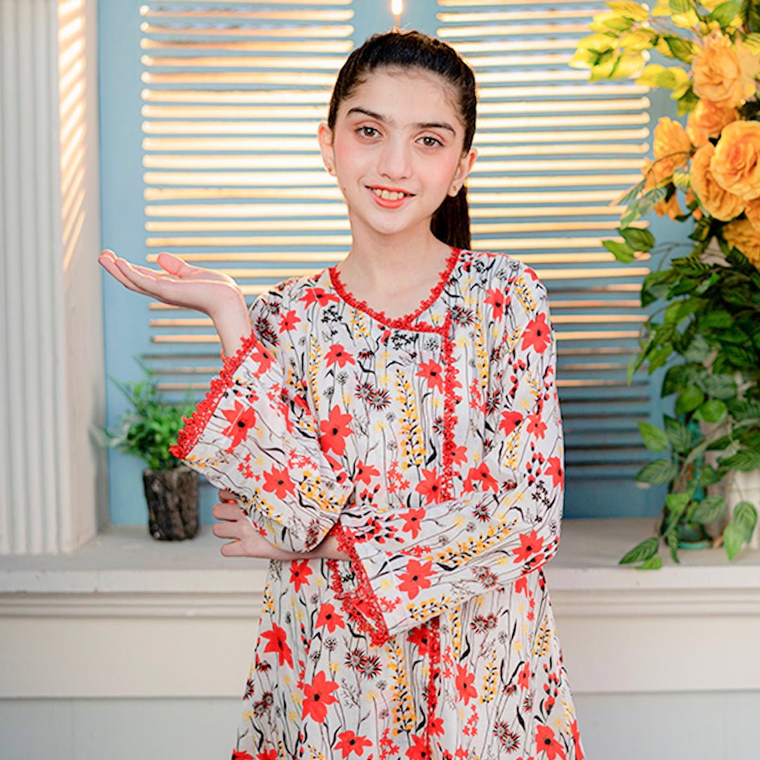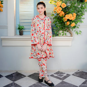 Product Description: Step into a world of floral elegance with "Gulzar," a vibrant ensemble designed to capture the beauty of a blooming garden. This two-piece suit features an intricate all-over print of radiant red blossoms and delicate golden-yellow vines set against a clean, off-white backdrop. The shirt is designed with a unique asymmetrical wrap-style front, highlighted by a dainty red pom-pom lace trim that follows the neckline and hem. Paired with matching printed trousers, this outfit offers a refreshing and playful look that is perfect for any sunny summer day.