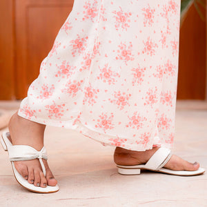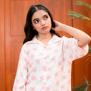 Product Description: Effortlessly sweet and sophisticated, "Noori" is the perfect companion for warm summer afternoons. This two-piece set is crafted from soft, premium cotton in a clean off-white base, beautifully accented with a delicate all-over pink floral print. The shirt features a modern button-down design with a crisp collar and relaxed, wide-cut sleeves for a contemporary twist on a classic look. Paired with perfectly coordinated printed wide-leg trousers, this ensemble offers a seamless, elongated silhouette that is as comfortable as it is stylish.