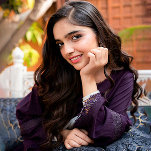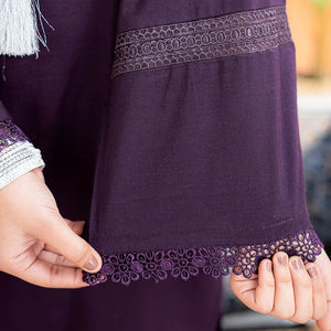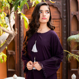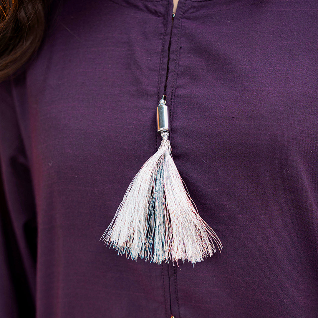 Product Description: Define elegance with "Ruh," a masterpiece of deep, moody tones and delicate craftsmanship. This two-piece ensemble is set on a rich dark purple cotton base, offering a sophisticated and regal look for the summer season. The shirt is intricately detailed with matching tonal lace inserts on the sleeves and hemline, creating a subtle play of texture. Featuring a minimalist round neckline adorned with long, silky tassels, this outfit strikes the perfect balance between modern chic and traditional grace. Paired with coordinated dark purple trousers, "Ruh" is the ultimate choice for an effortless yet high-fashion statement.