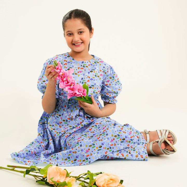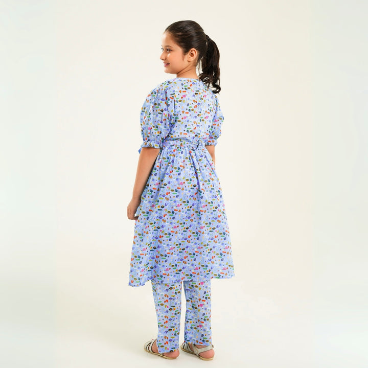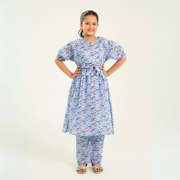Add a pop of color to her wardrobe with this multicolored digital printed lawn frock and trouser set. Lightweight, comfy, and perfect for everyday fun.
