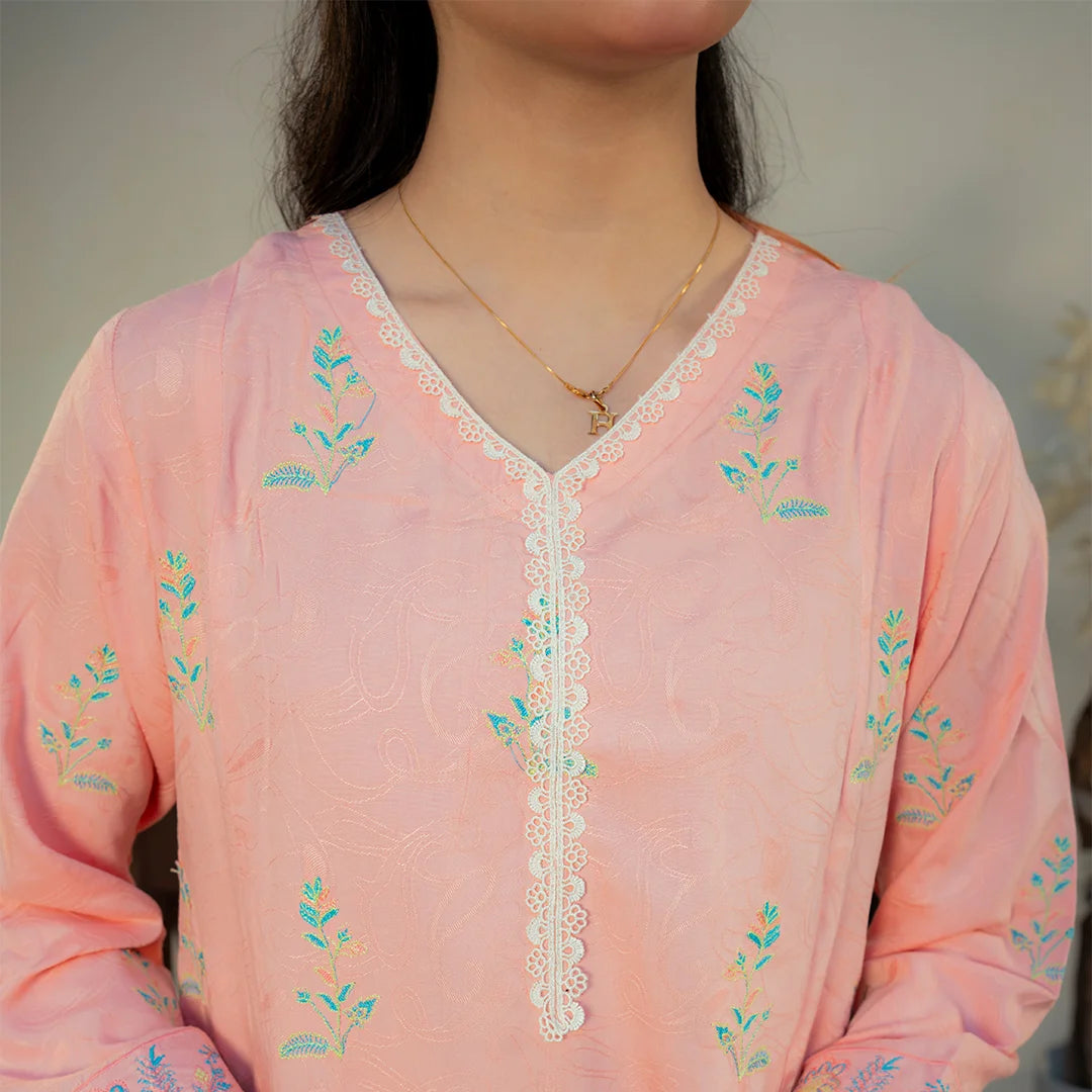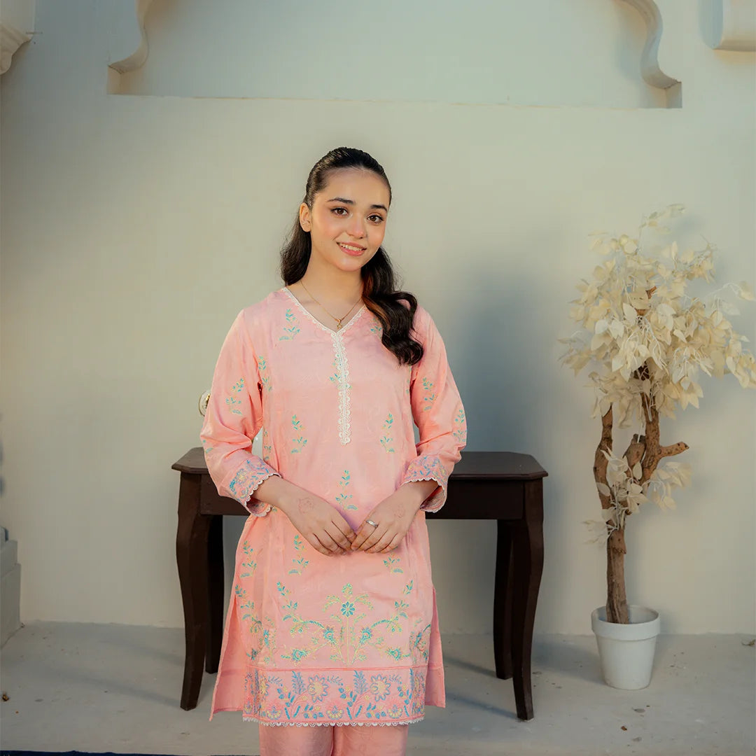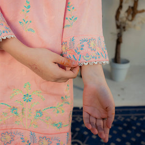 Product Description: Bloom with grace in "Shafaq," a charming ensemble in a soft pastel pink shade. The shirt is delicately embroidered with intricate floral motifs in refreshing blue and green hues, concentrated on the hem and sleeves. Accented with elegant white lace detailing on the neckline and cuffs, this two-piece suit is paired with matching solid trousers for a sweet and sophisticated summer look.