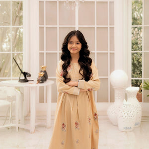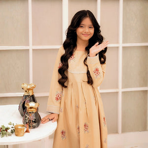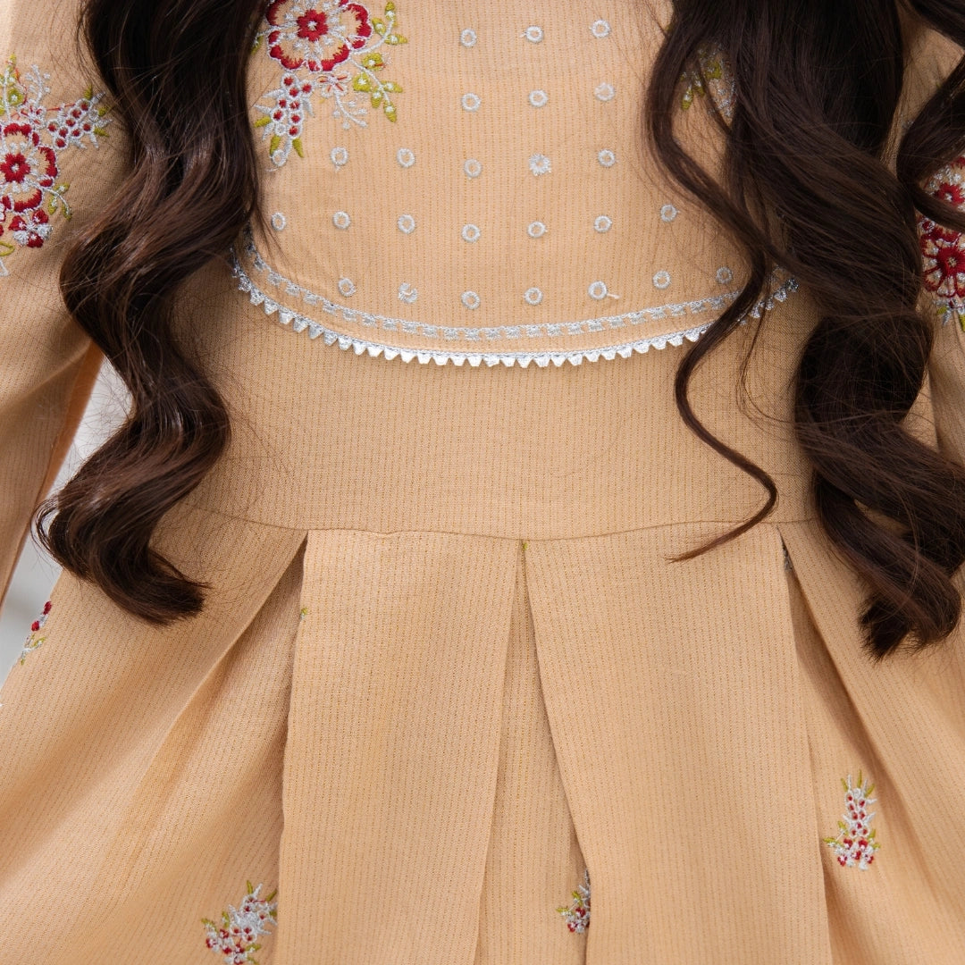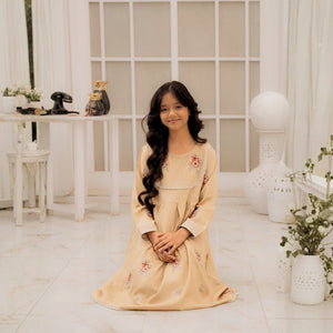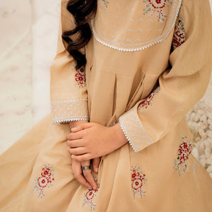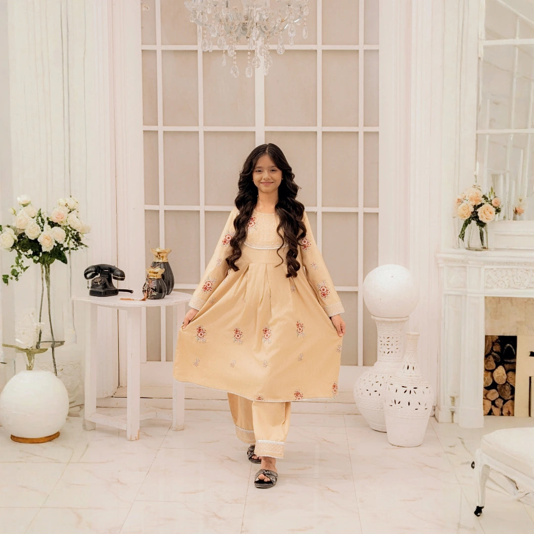 A cozy beige khaddar outfit beautifully detailed with soft floral embroidery. Designed for winter warmth and everyday elegance, this charming suit keeps your little one stylish and comfortable all season long.