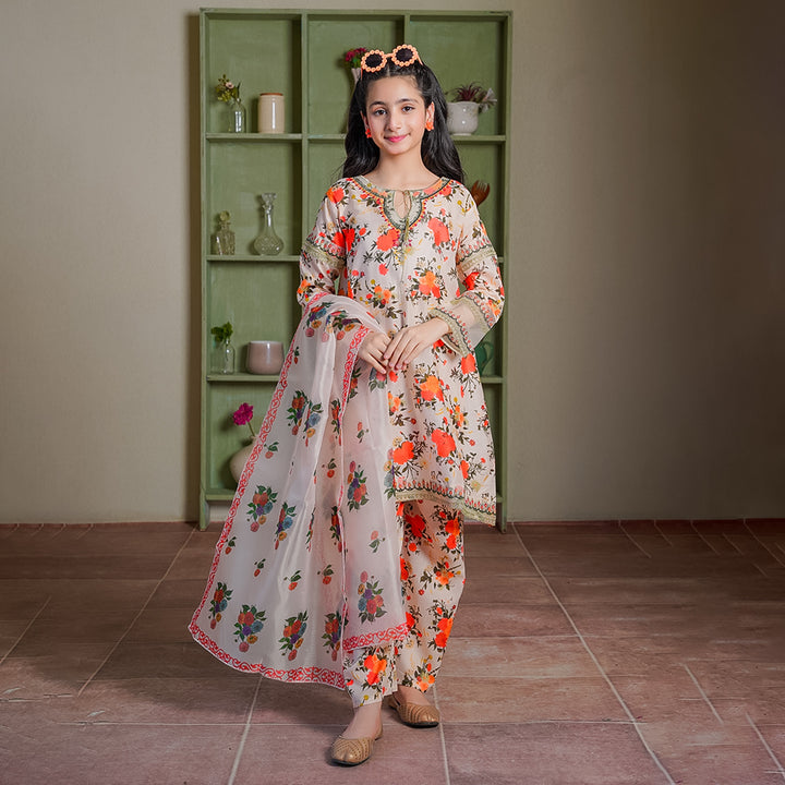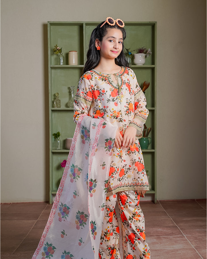 This elegant 3-piece lawn suit features delicate on breathable fabric, paired with a digitally printed chiffon dupatta for a graceful finish. A versatile choice for both festive and everyday style.