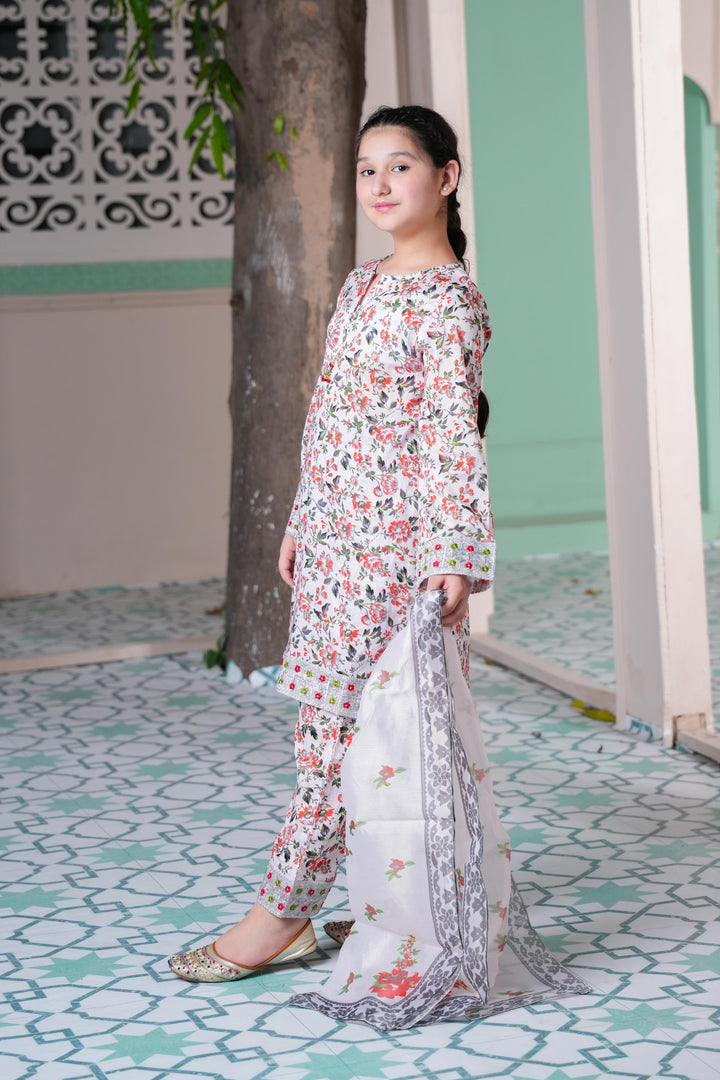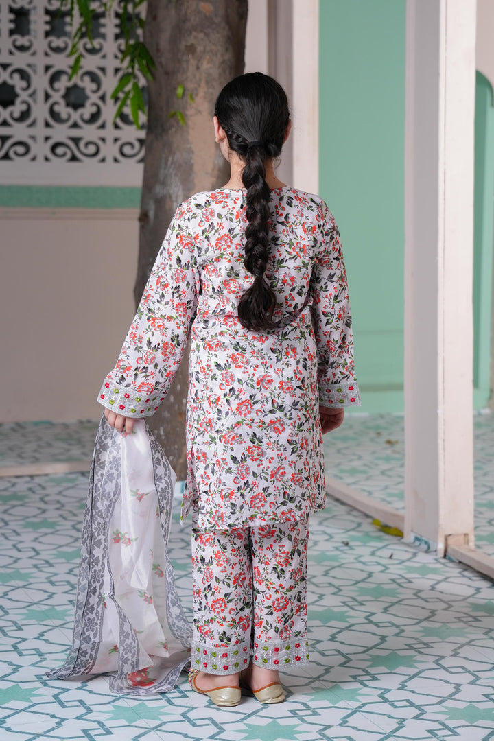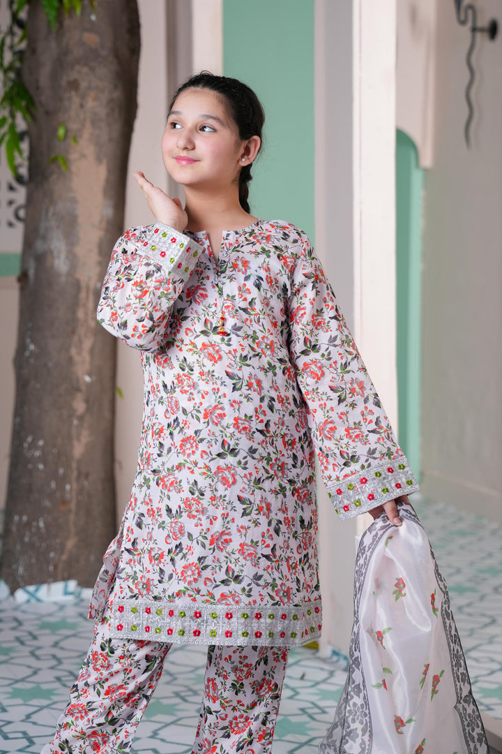 This elegant 3-piece lawn suit features delicate on breathable fabric, paired with a digitally printed chiffon dupatta for a graceful finish. A versatile choice for both festive and everyday style.