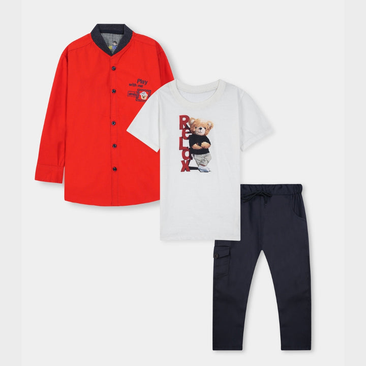 The product features a Rib round neckline, Full regular Cuff sleeves, and a casual style. It comes in a 3-piece set with a Red color and graphic print pattern. The top is made of twinkle fabric and the pants are made of cotton fabric, both with slight stretch. This set can be either machine washed or professionally dry cleaned for care.