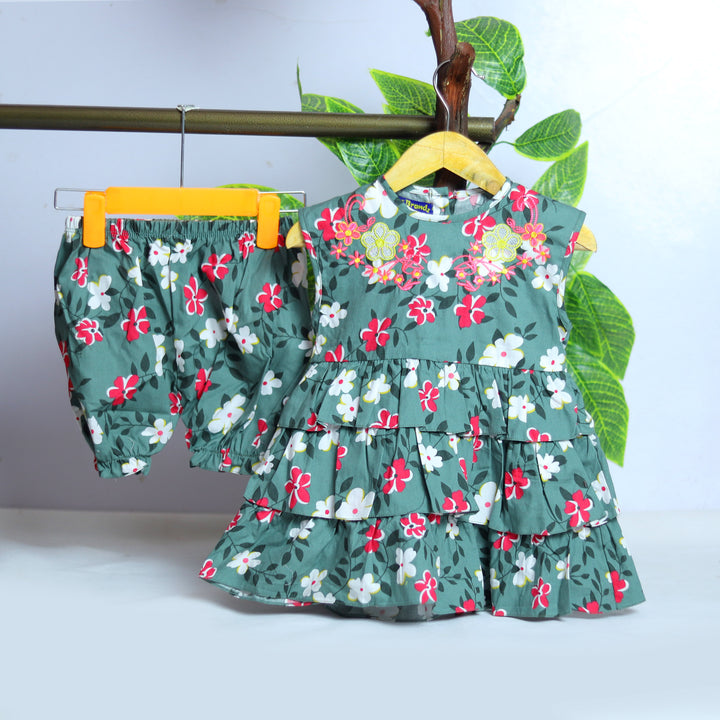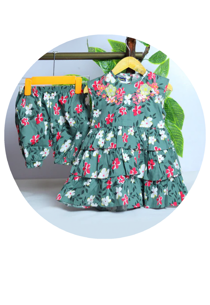 Green 2 PC Printed Frock With Stunning Embrodiery