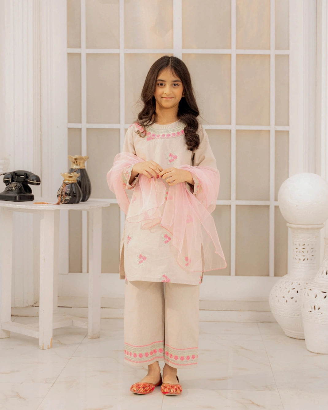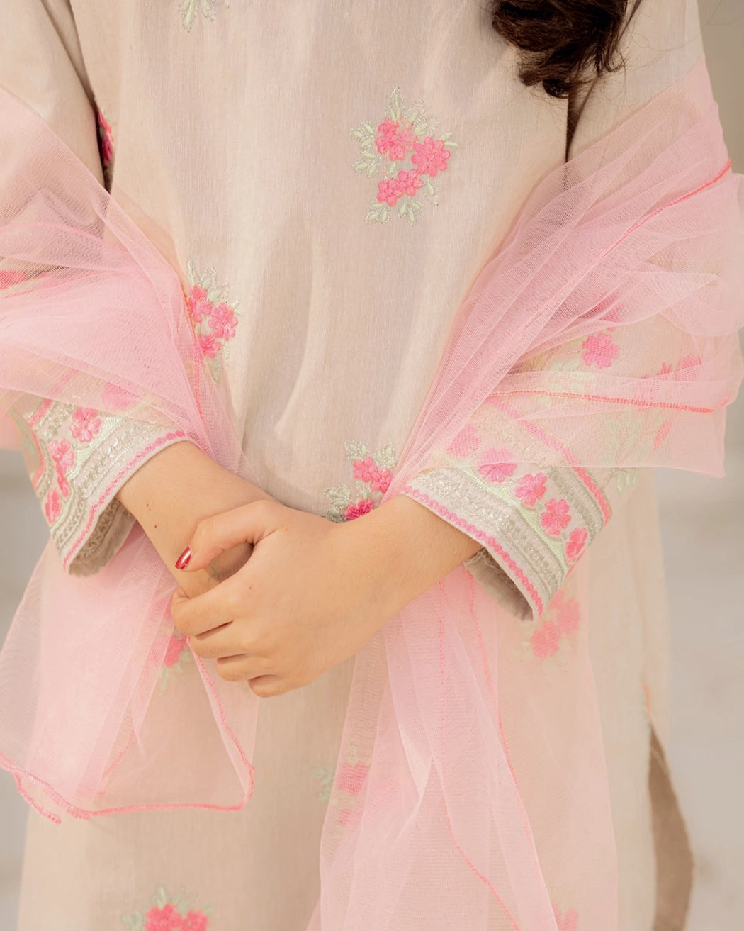 A graceful winter khaddar ensemble featuring subtle floral embroidery in soft hues. Comfortable, elegant, and ideal for everyday winter style.