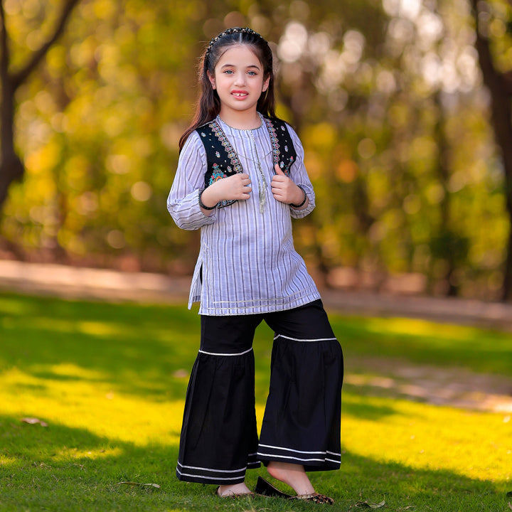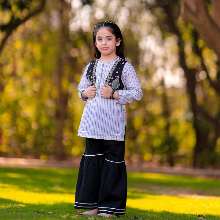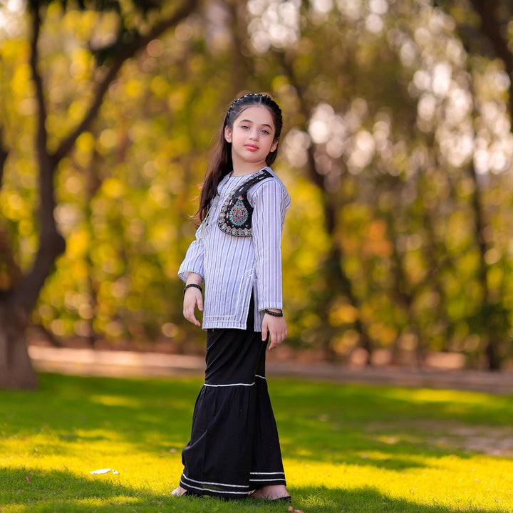 Make a timeless style statement with this elegant Traditional Style Shirt Koti with Gharara Pair. Designed for festive occasions and formal gatherings, this ready-to-wear ensemble brings together cultural charm and modern comfort — no stitching required!