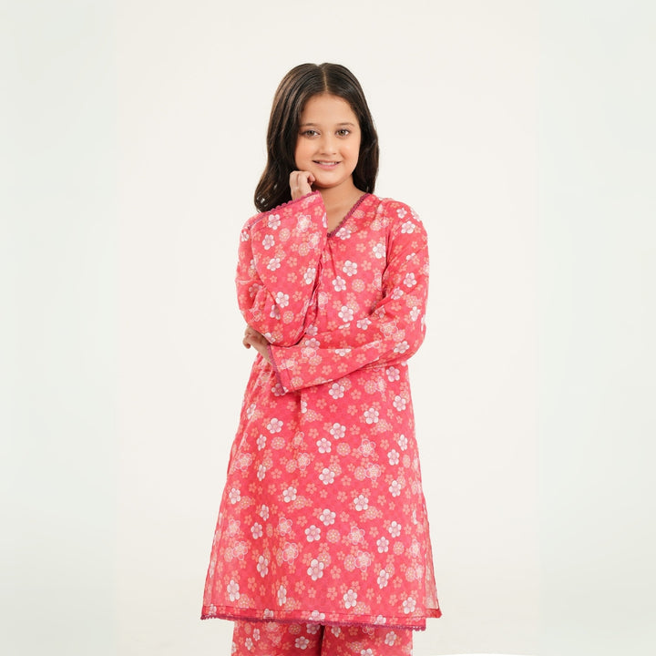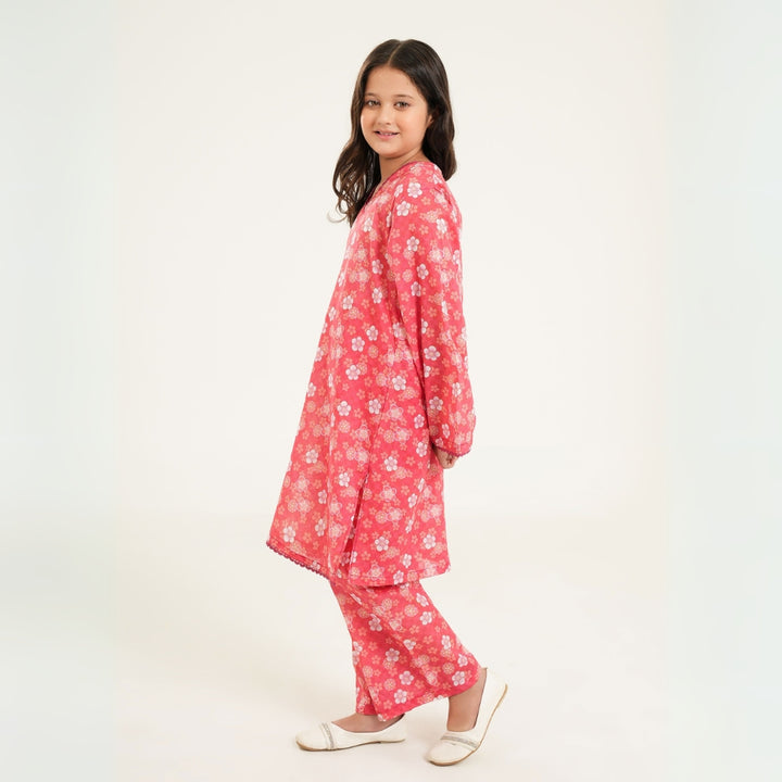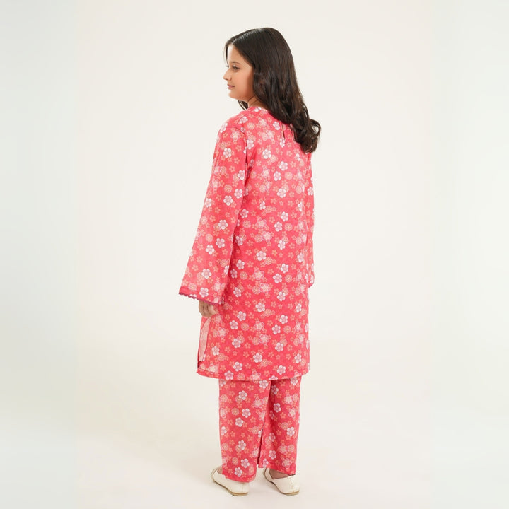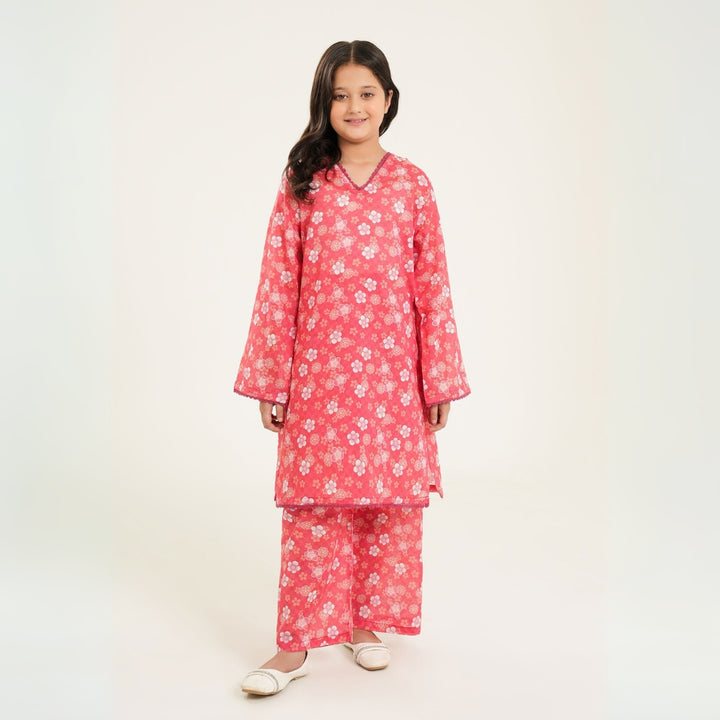 Brighten up your little girl’s style with this vibrant 2-piece printed lawn suit. Featuring a stitched shirt and trouser with playful multicolored patterns—perfect for casual outings and summer days.