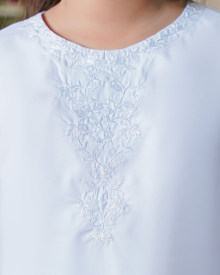 Introduce your little one to timeless elegance with this beautifully crafted white outfit, designed with both tradition and comfort in mind. Made from soft, breathable fabric, the ensemble features delicate embroidery along the neckline, sleeves, and hem, offering a graceful yet modest look perfect for festive occasions, family gatherings, or religious events.