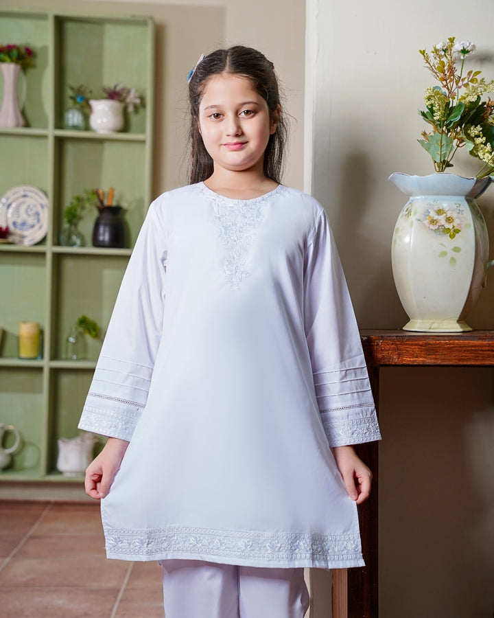 The straight-cut kurta paired with matching trousers provides ease of movement while maintaining a classic silhouette. Whether it's Eid, a formal celebration, or a cultural event, this outfit blends simplicity with sophistication, making it an essential addition to any young girl's wardrobe.