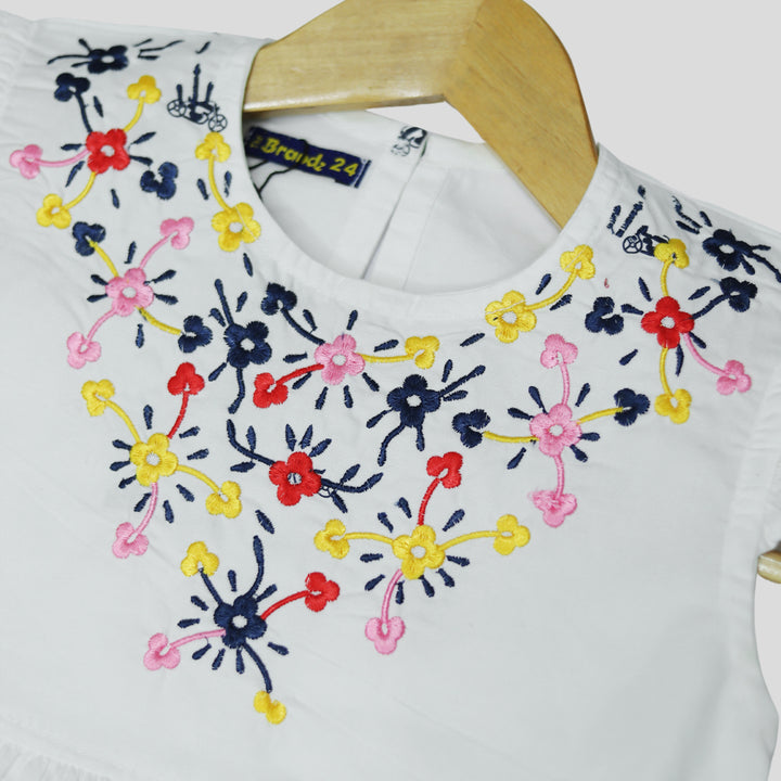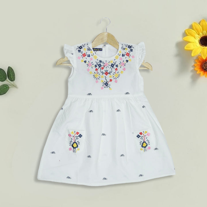 A lovely white frock featuring delicate embroidery and subtle prints. Crafted from 100% cotton to keep her cool and comfortable.